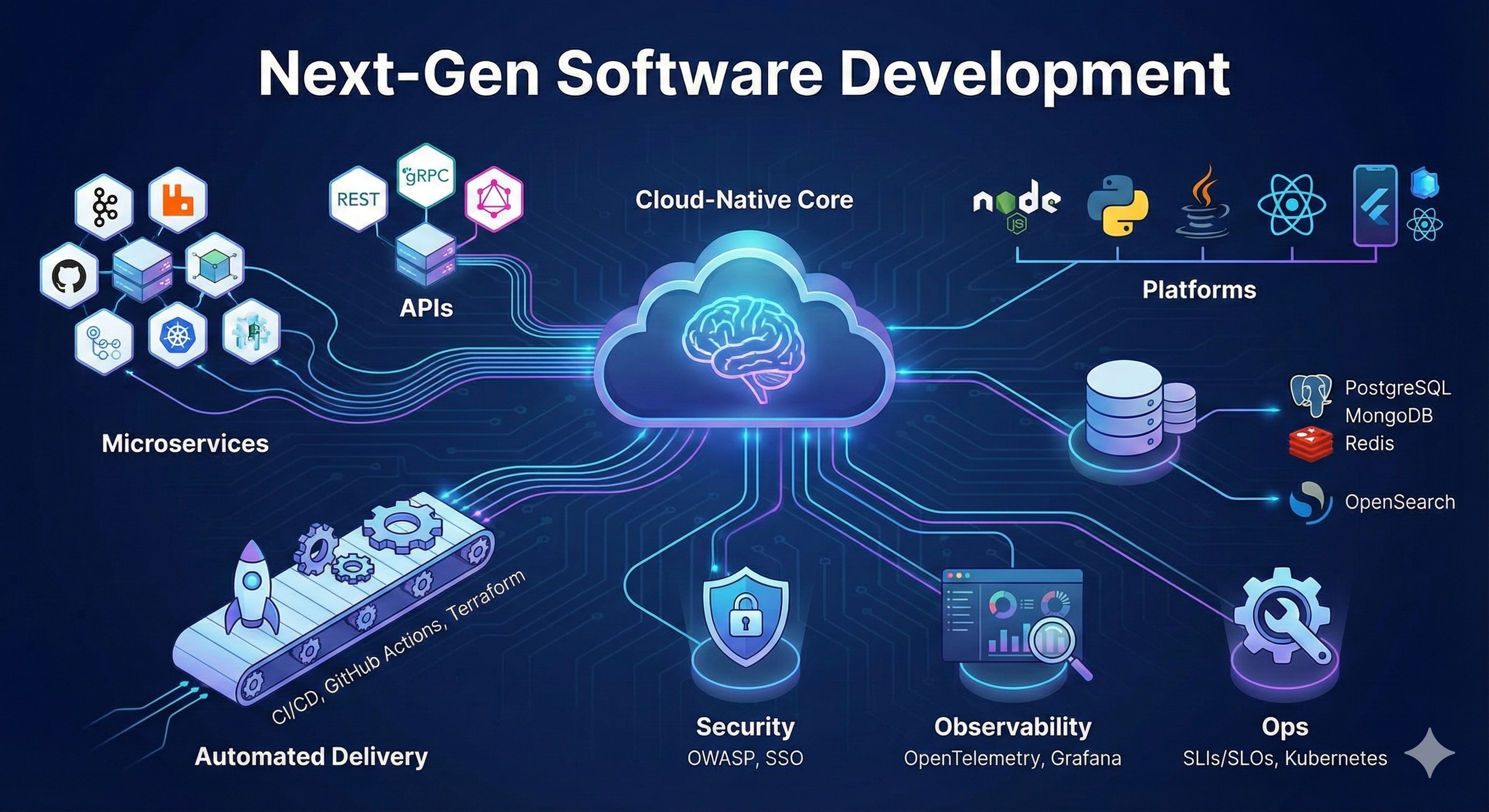 We design and ship modern, cloud-native products using event-driven microservices, clean API contracts, and automated delivery—so you gain speed today and reliability at scale tomorrow.
